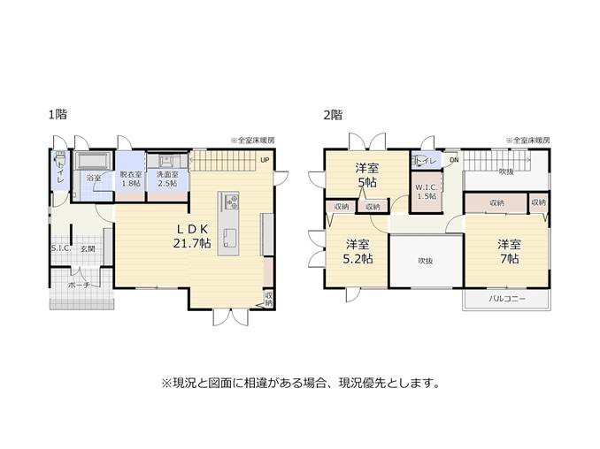 1階LDK21.6帖、2階洋室5帖、洋室5.25帖、洋7帖、